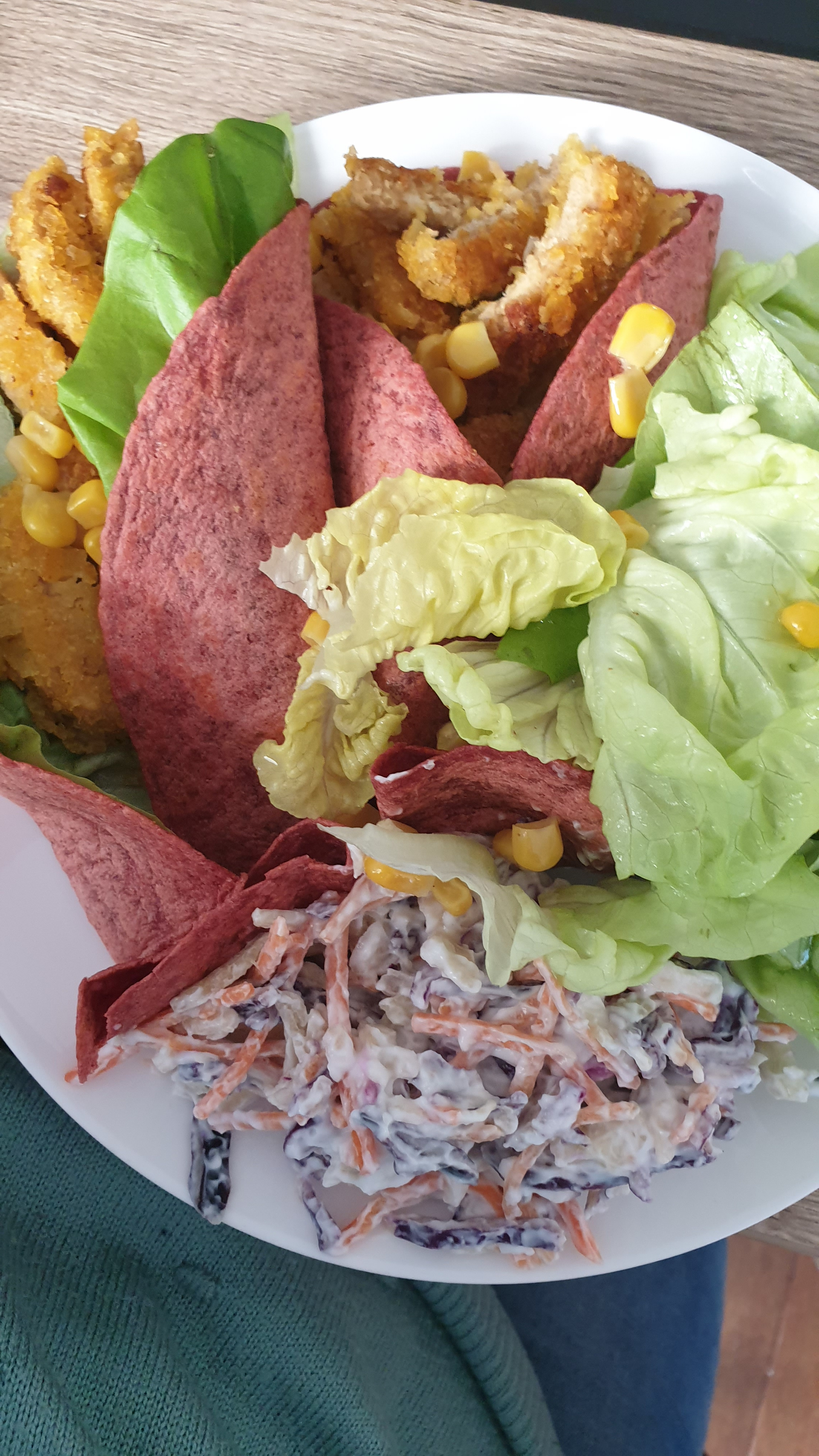 * No Fairytales bietentortilla met crispy ”no chicken” met kimchi mayo en koolsla