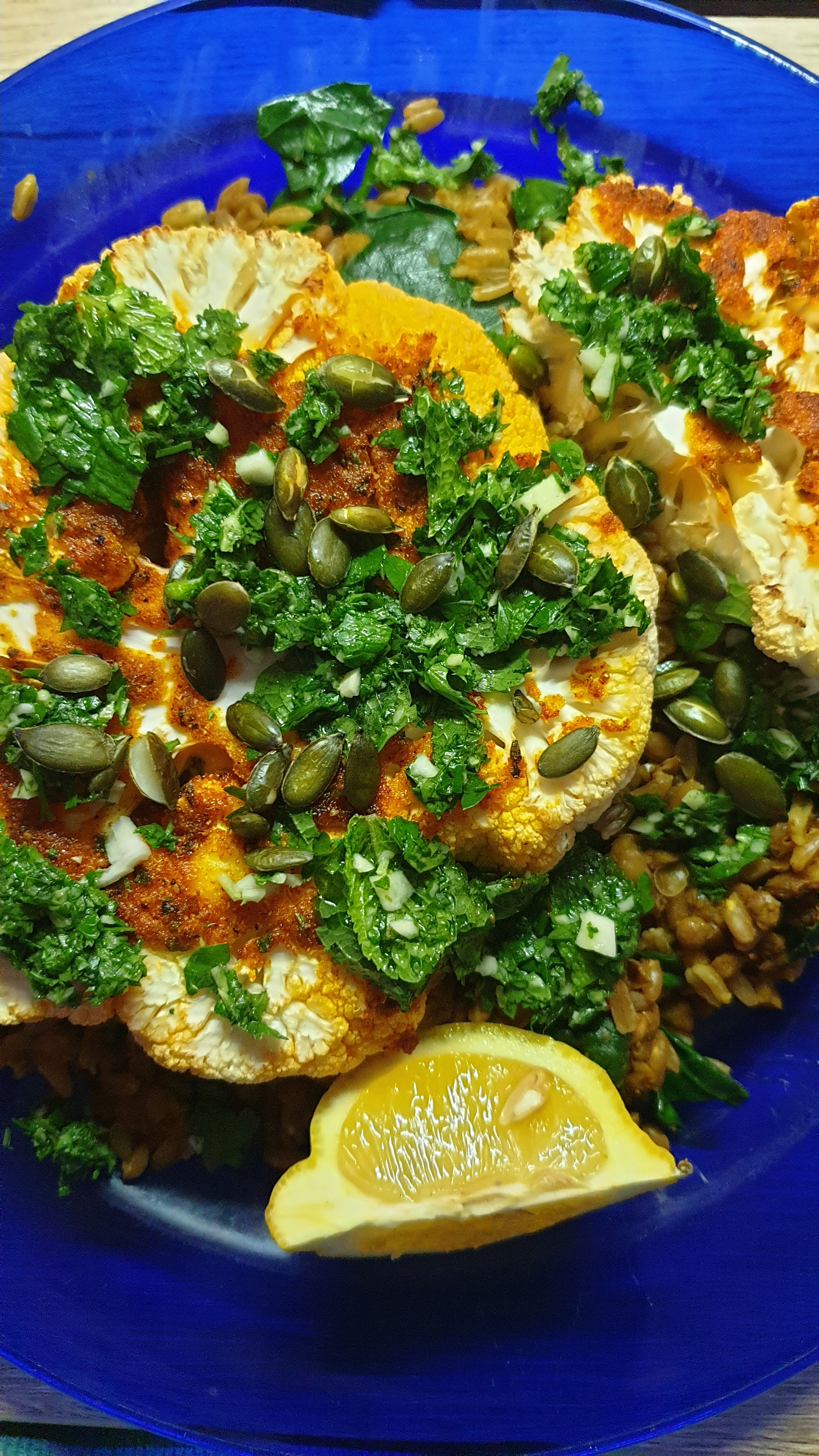 * Bloemkoolsteak met zelfgemaakte salsa verde met freekeh-linzensalade