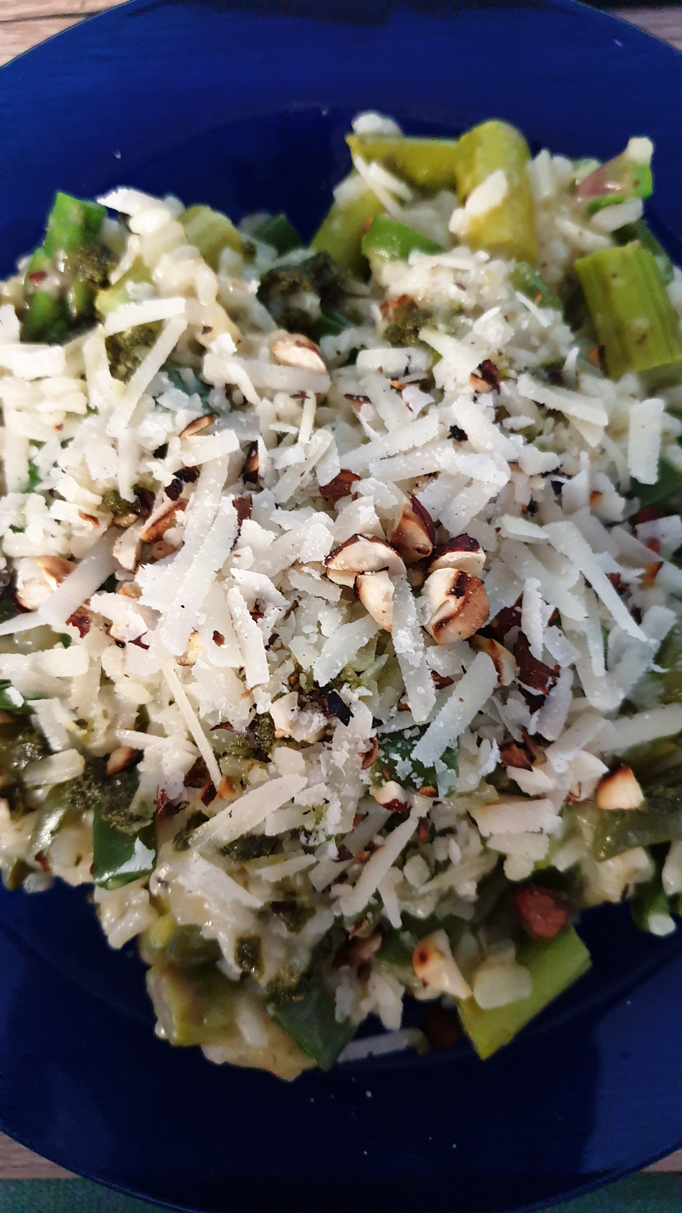 * Risotto met groene asperges met basilicumcrème en snijbonen
