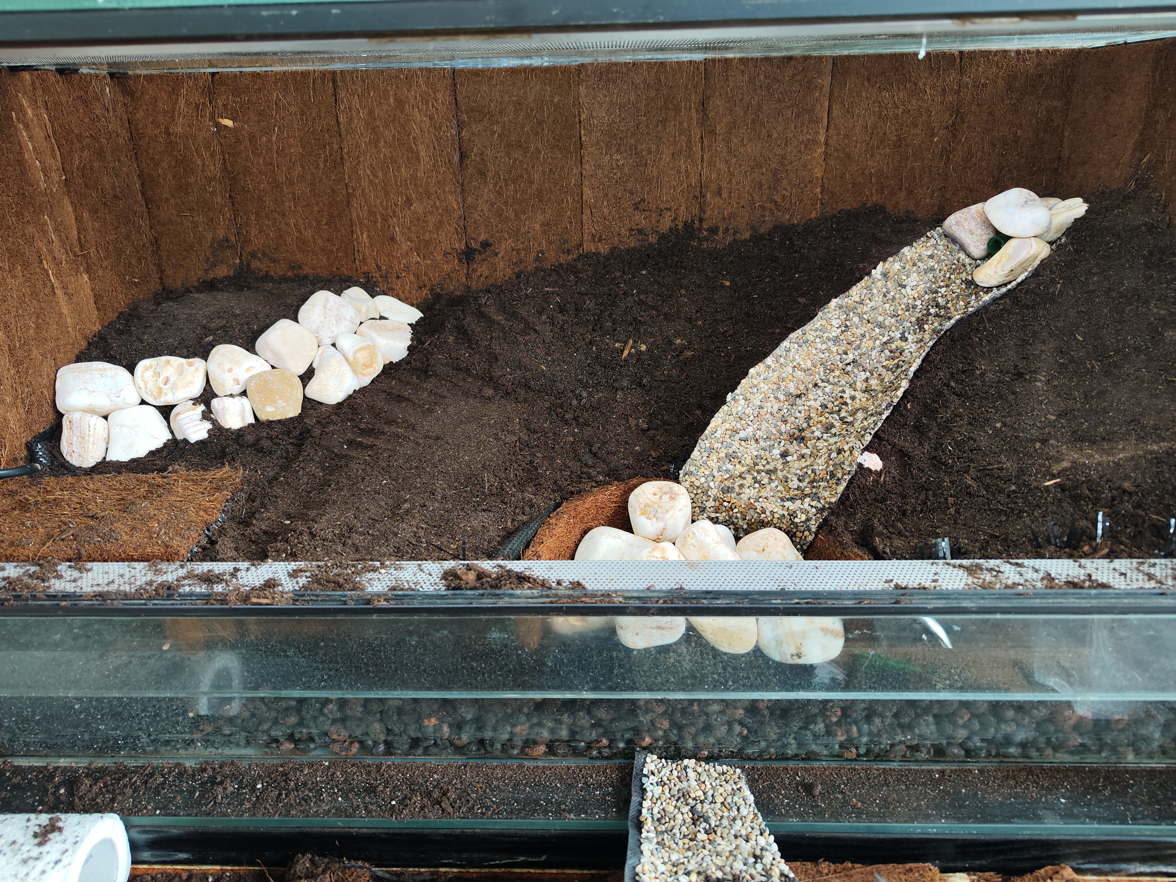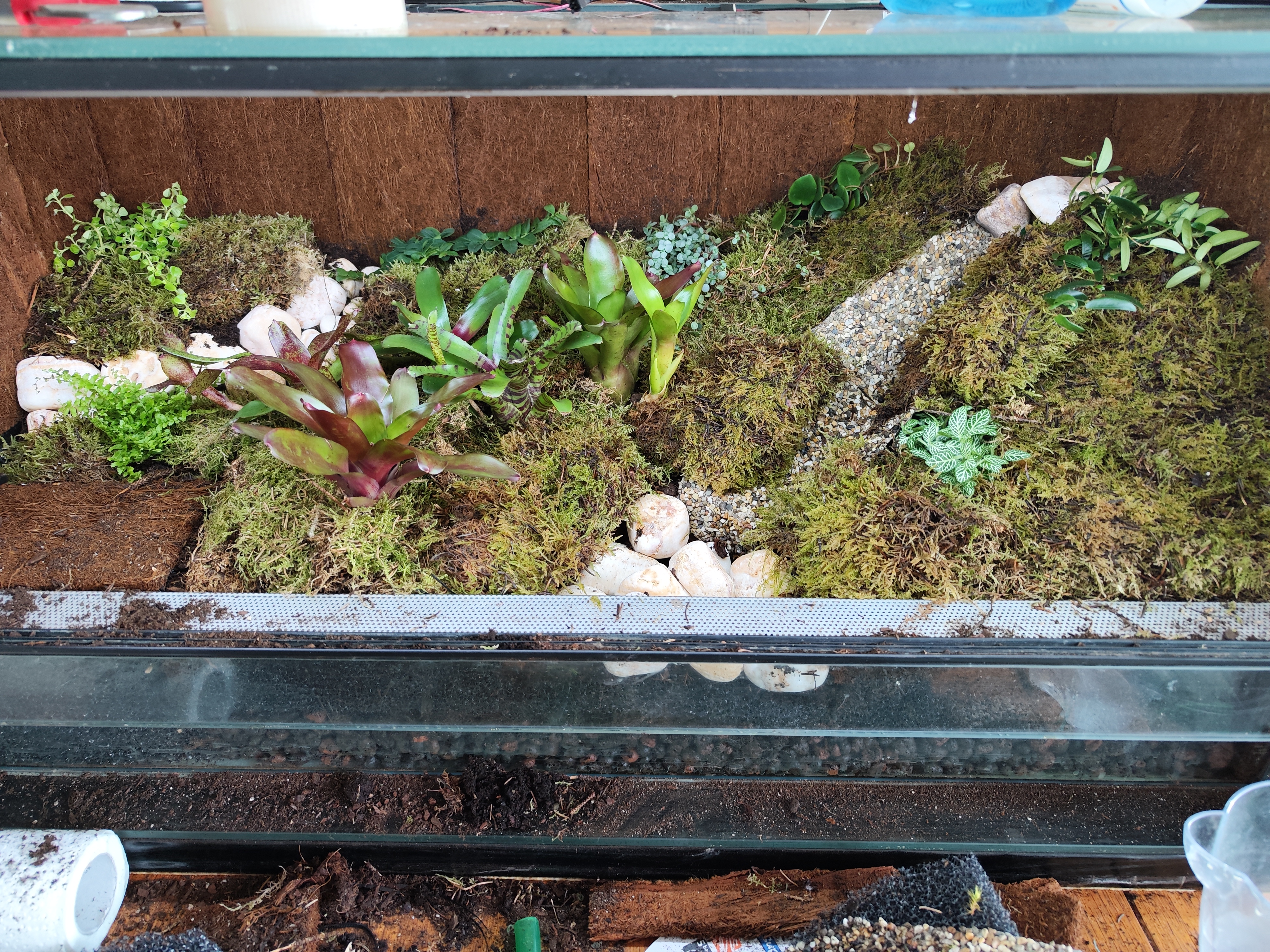 Het terrarium is volgebouwd, planten erin en water loopt. Het is erg mooi geworden. Nu zitten er nog dieren in, maar er komen kikkers in. Voor nu laten we eerst de boel even aan elkaar wennen en zich ontwikkelen en aanslaan. Onderaan video met het waterloopje.