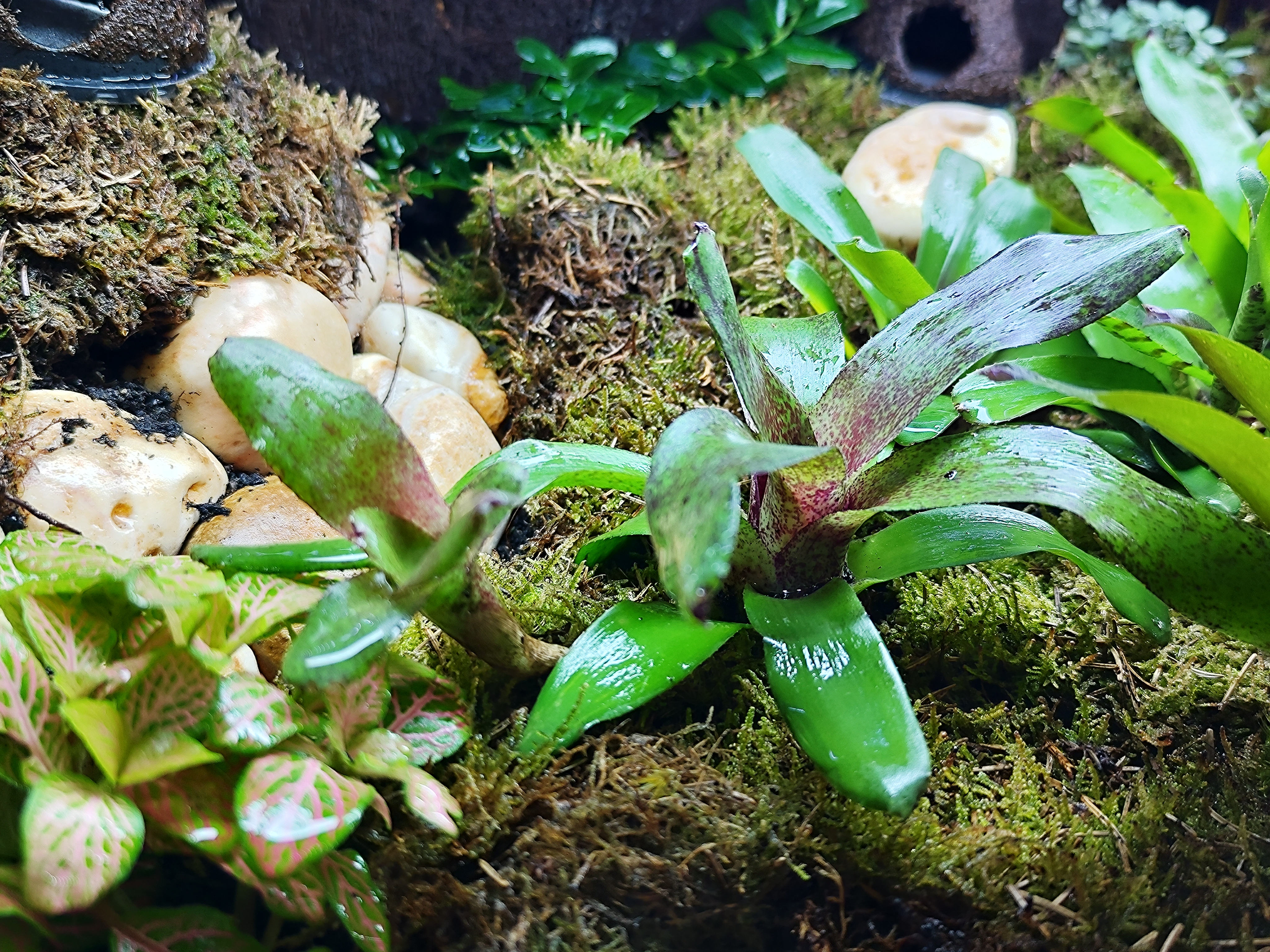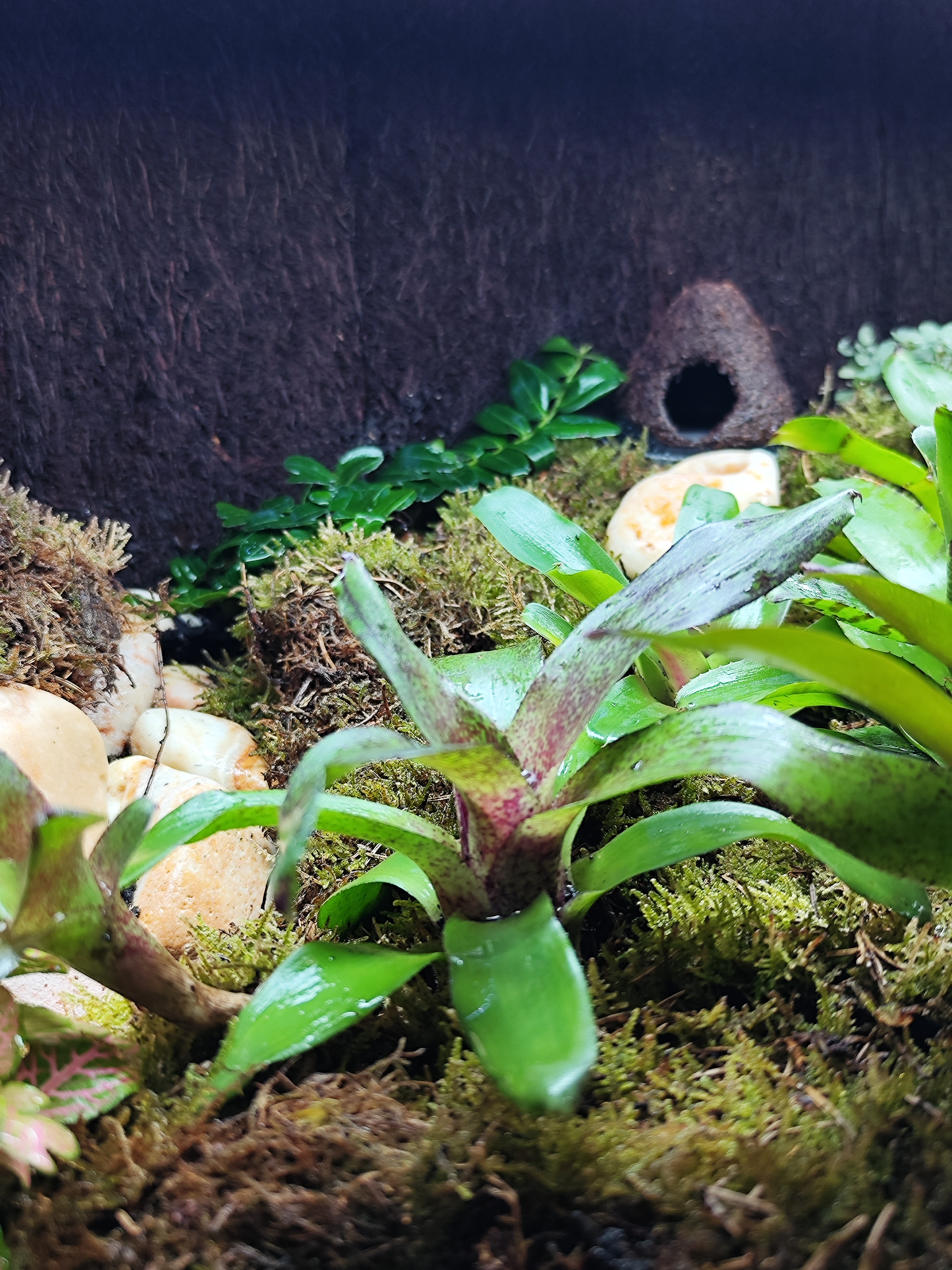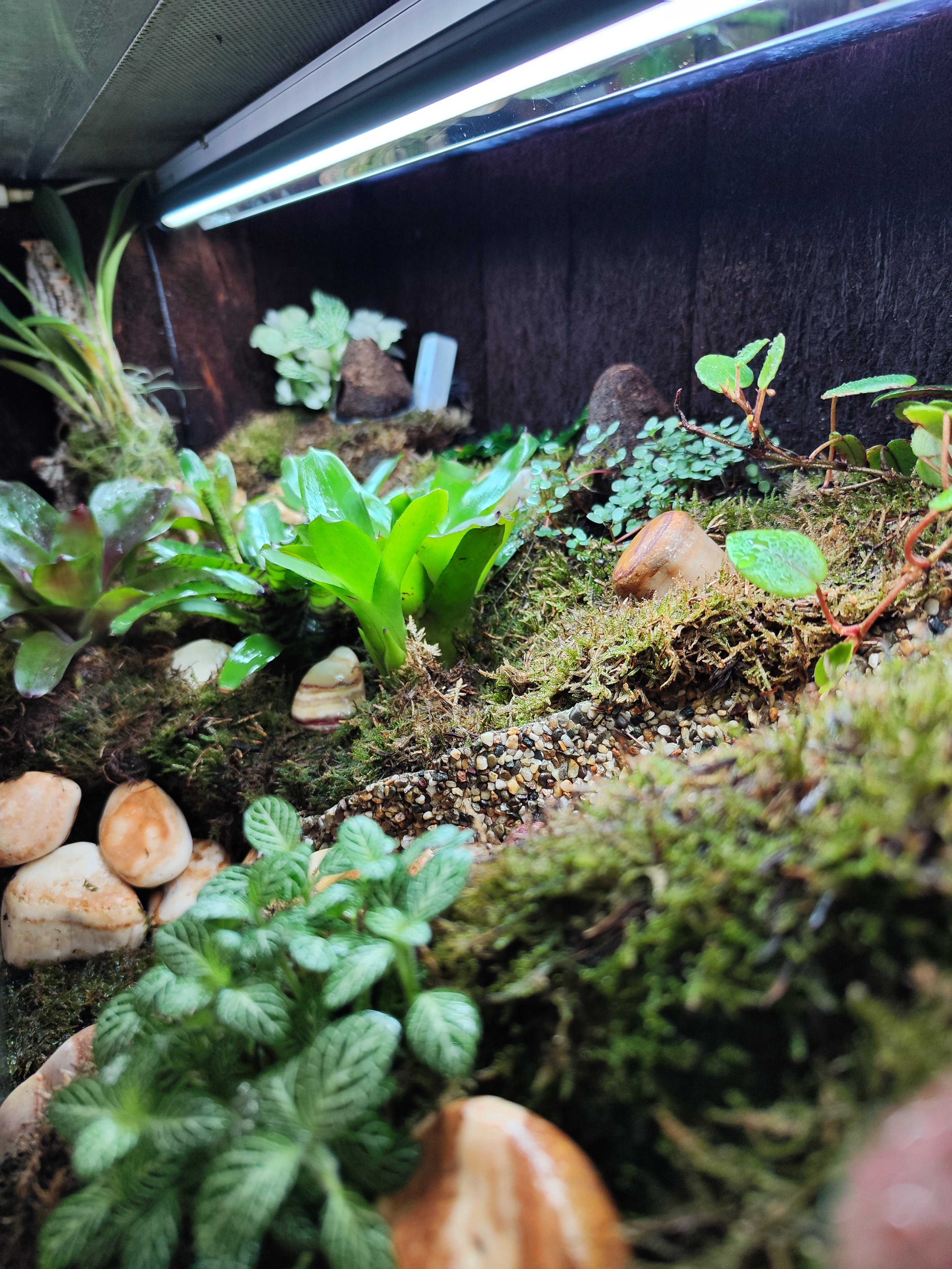 De nieuwe kikker bak is erg mooi aan het worden, water beekje loopt goed, warmte is prima, vochtigheid hoog genoeg, UVB lamp erin gemaakt en led lampen kortom nu is alles aan het groeien en mooi aan het zijn. Volgende stap is kikkers erin!