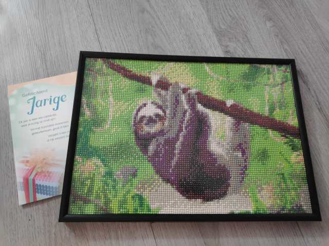 Ik was bezig met een nieuw diamond paint, ronde steentjes 24-34 cm, nou kan ik zeggen die was als verassing voor Elisabeth. Een luiaard zij is daar dol op en ze vind hem erg mooi. Ze kreeg hem via de post omdat de lijst verlaat geleverd werd, maar ze is er erg blij mee en stuurde deze foto!